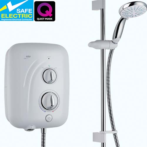 Introducing the quietest pumped electric shower. Mira Elite QT is quieter than any other shower of its kind, without any loss of power.Pressure stabilised temperature control keeps your selected showering temperature consistent Separate power and temperature/flow controls to fine tune your shower experience Push button on/off so you can leave the power and temperature controls at your preferred setting Independently tested to be quieter than any other pumped electric shower An integrated pump proves a strong and consistent flow, ideal for a low pressure water supply Mira Clean-flo™ technology ensures the filter is easily accessible for easy cleaning to maintain shower performance, ideal for a low pressure water supply Mira Clearscale™ technology reduces limescale by half for a better performing, longer lasting shower Four spray showerhead with rub-clean nozzles for easy limescale removal Energy efficiency class A